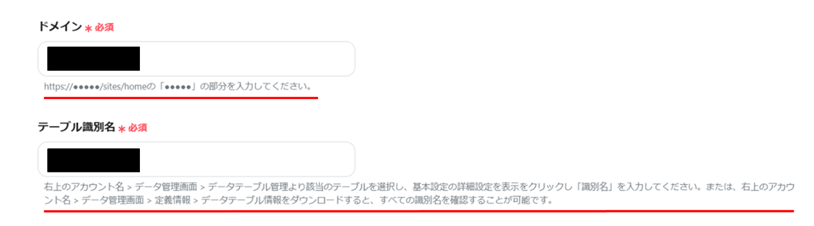 (3)「API接続設定」画面から、赤線を確認の上、ドメイン、テーブル識別名を入力します。