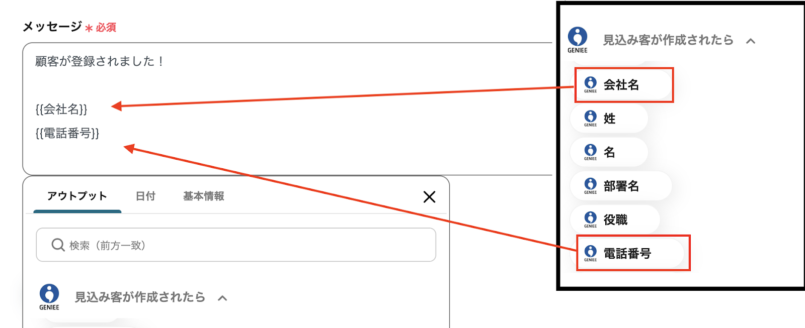(以下の画面はアウトプット【会社名】【電話番号】をメッセージ内に付与したものです。)