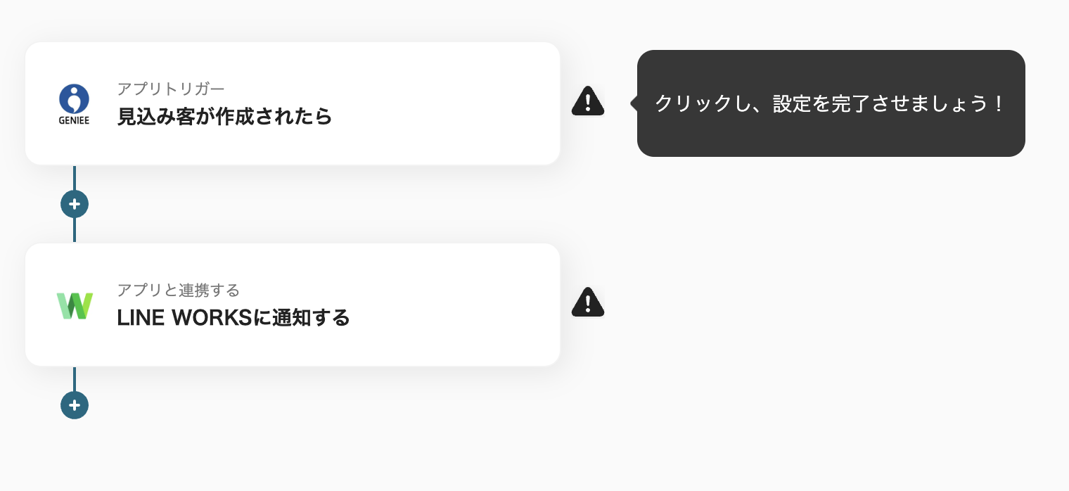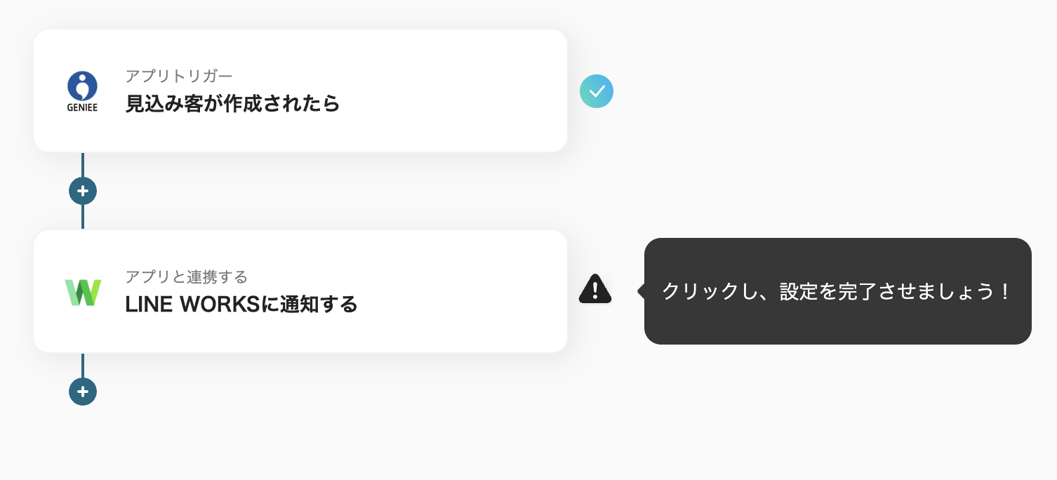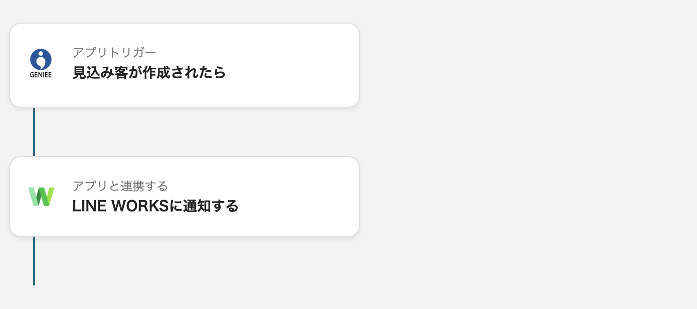 GENIEE SFA/CRMで見込み客が登録されたことをGENIEE SFA/CRMのAPIを利用して受け取り、LINE WORKSの提供するAPIを用いて事前に指定した情報をLINE WORKSに通知することで実現できます。