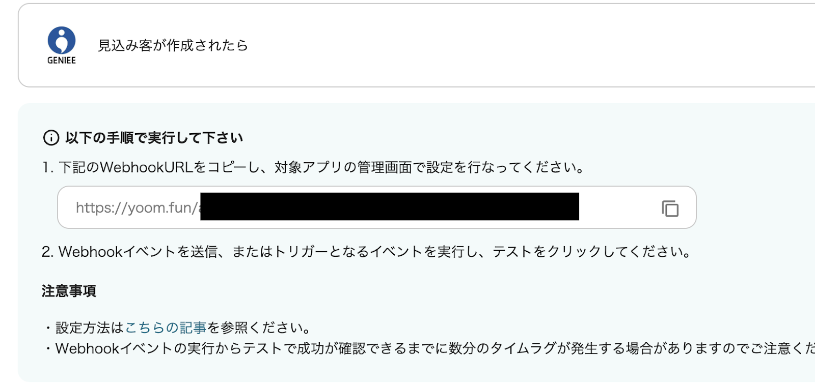 (4)次の画面では表示されたWebhookURLをコピーし、GENIEE SFA/CRMの管理画面で設定を行なう必要があります。