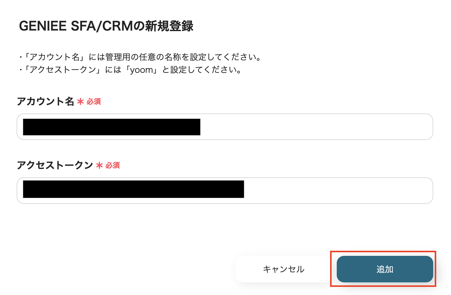 (3)「アカウント名」に管理用の任意の名称を、「アクセストークン」には「yoom」と入力し[追加]をクリックしてください。