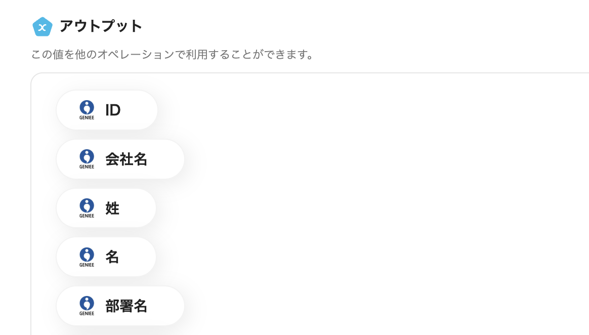 アウトプット情報は、「この値を他のオペレーションで利用することができます。」という注釈の通り、この後のステップで引用・活用できます。