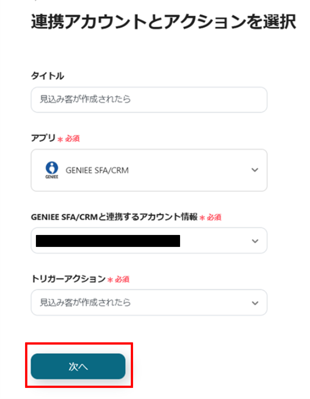 (2)の「連携アカウントとアクションを選択」画面から、GENIEE SFA/CRMと連携するアカウント情報を確認し、トリガーアクションは「見込み客が作成されたら」のままで「次へ」をクリックします。