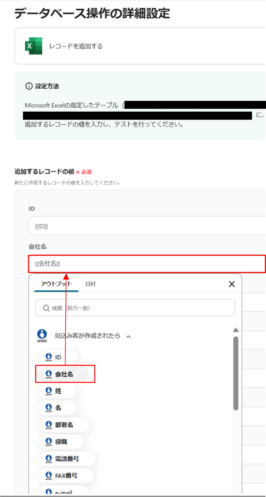 (3)「データベース操作の詳細設定」画面から、追加するレコードの値をアウトプットから選択します。