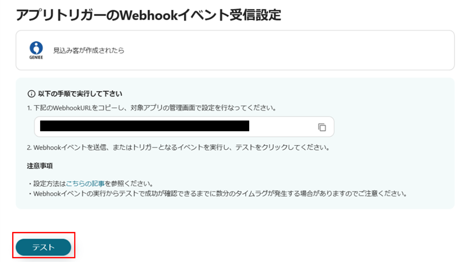 (3)「アプリトリガーのWebhookイベント受信設定」画面から、WebhookURLをコピーし、GENIEE SFA/CRMの管理画面で設定を行います。