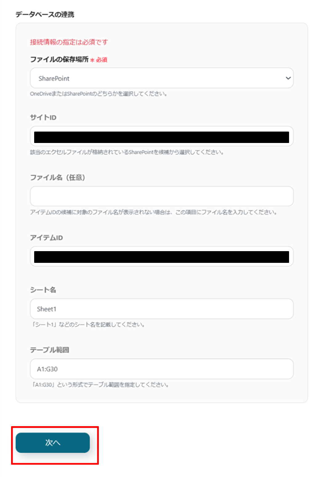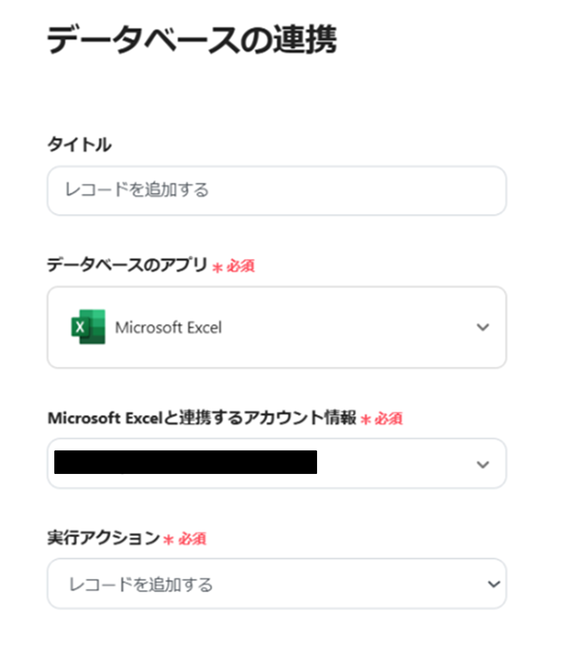 (2)Microsoft Excelの「データベースの連携」画面から、Microsoft Excelと連携するアカウント情報を確認し、実行アクションは「レコードを追加する」のままにします。