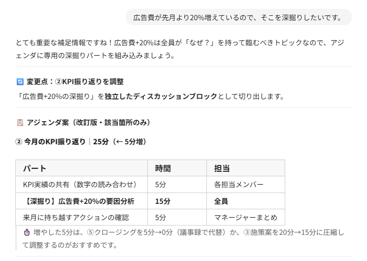 AIとのラリーを通じて、非常に現実的かつ即戦力となるアジェンダが完成しました。