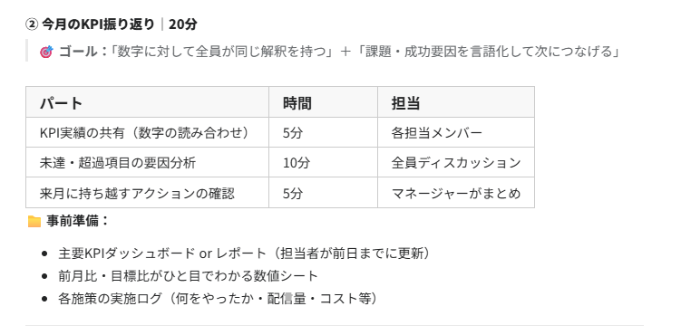 ①構成力: 会議の目的と時間を踏まえた現実的な時間配分で、各セクションで「何を決めるべきか」というゴールも明確に定義されています。提示された「事前準備」の指摘も妥当であり、このまま招集通知に貼り付けられるレベルです。