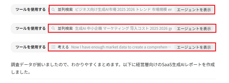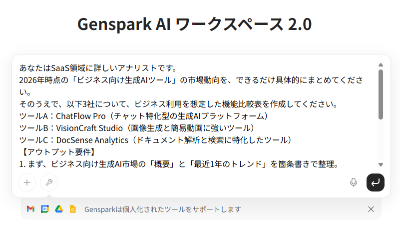 最初の検証では、2026年時点の「ビジネス向け生成AIツール」の市場動向調査と、競合3社の比較表作成を指示しました。