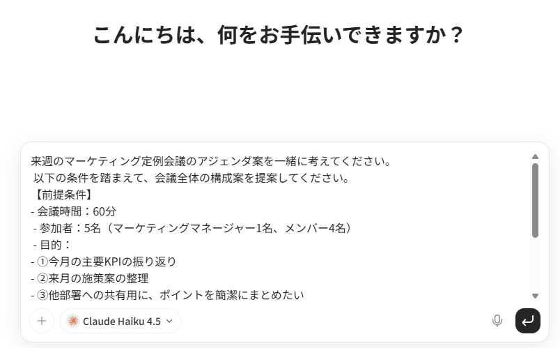 マーケティング定例会議を想定し、5名の参加者で60分という制約の中、KPIの振り返りから次月施策の整理までを詰め切れるか、5往復の対話(壁打ち)を実施しました。