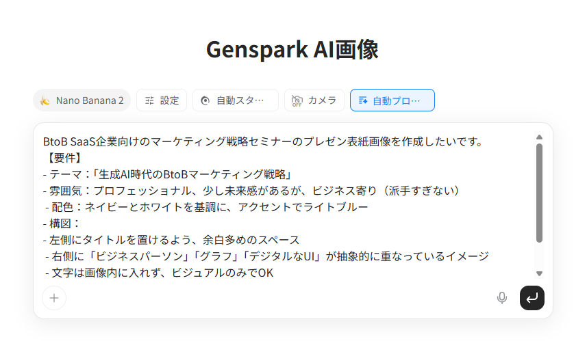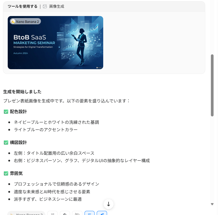 最後に、プレゼン資料用のビジュアル生成を行い、クレジット消費の「限界」を検証しました。BtoBセミナー用の表紙画像を、配色や構図を細かく指定して発注しています。
