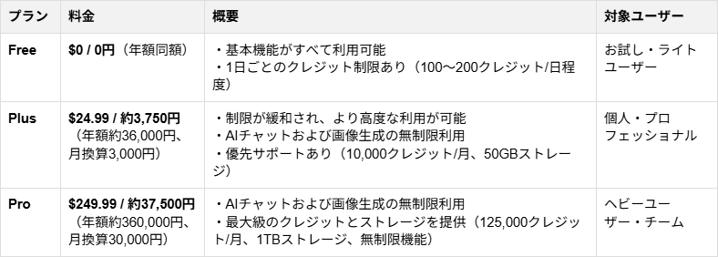 検索やチャットなどの基本的な操作でクレジットを消費しますが、動画生成などの高負荷なタスクにはより多くのクレジットが必要になる仕組みです。