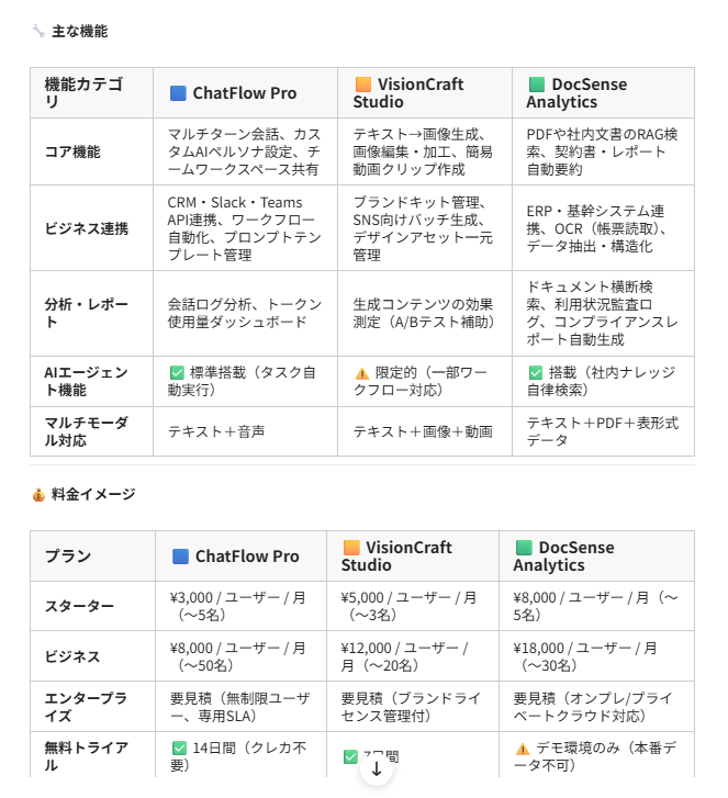 ②比較の精度: 架空の3ツールの比較においても、料金・導入難易度・セキュリティなど、意思決定に必要な項目に抜け漏れがありません。