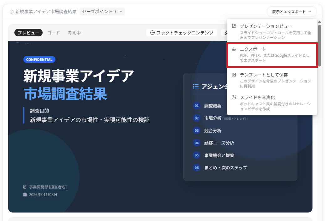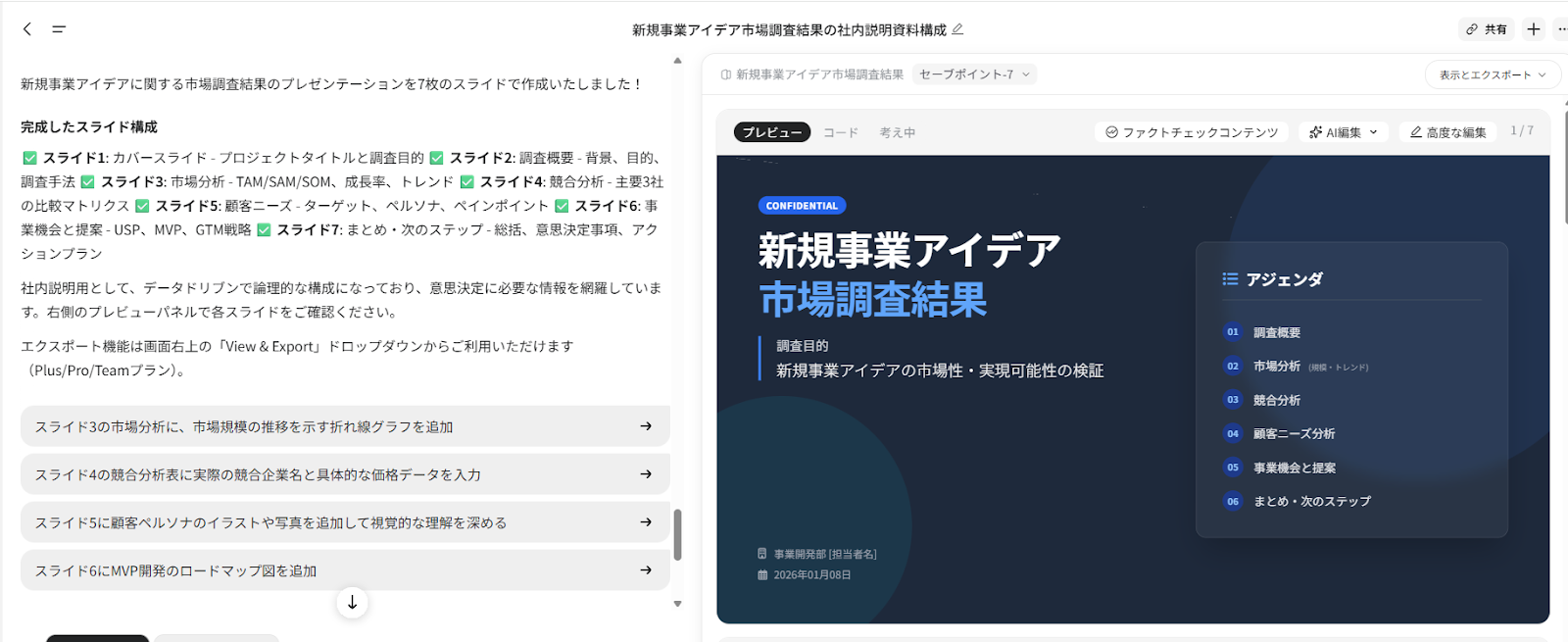 調べた内容を元に、ワンクリックまたは簡単な指示でプレゼンテーション資料(PPTX形式等)を生成できます。構成案からデザインまでAIが提案してくれます。