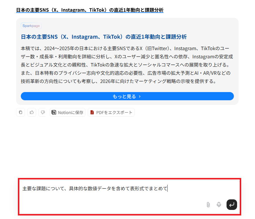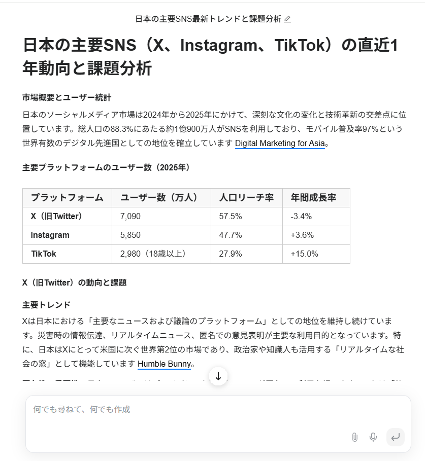 今回のように「X、Instagram、TikTok」と固有名詞を挙げ、さらに「直近1年」と期間を区切ることで、AIの検索精度が最大化されます。