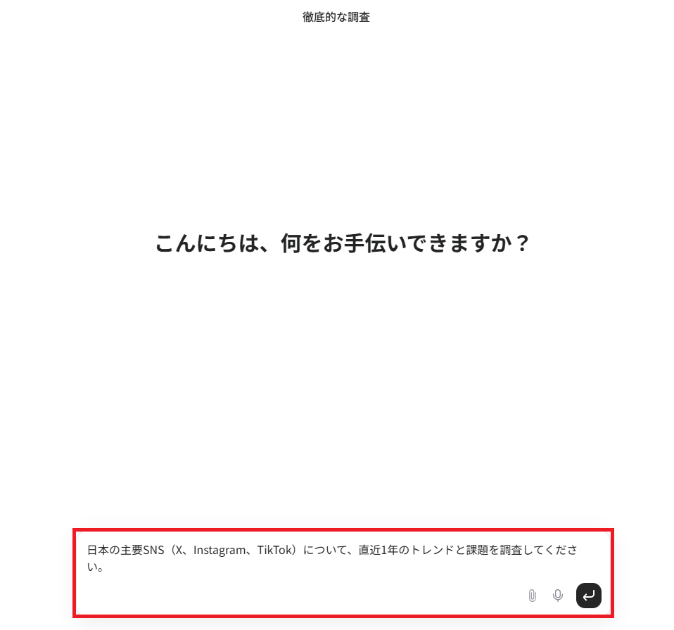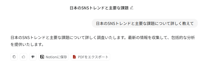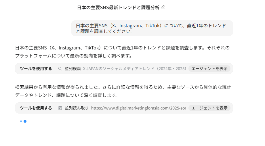 「日本のSNSについてトレンドと課題を調査してください」といった大まかすぎるテーマを入力すると、調査スコープの自動調整フェーズで処理が止まってしまう現象が発生します。
