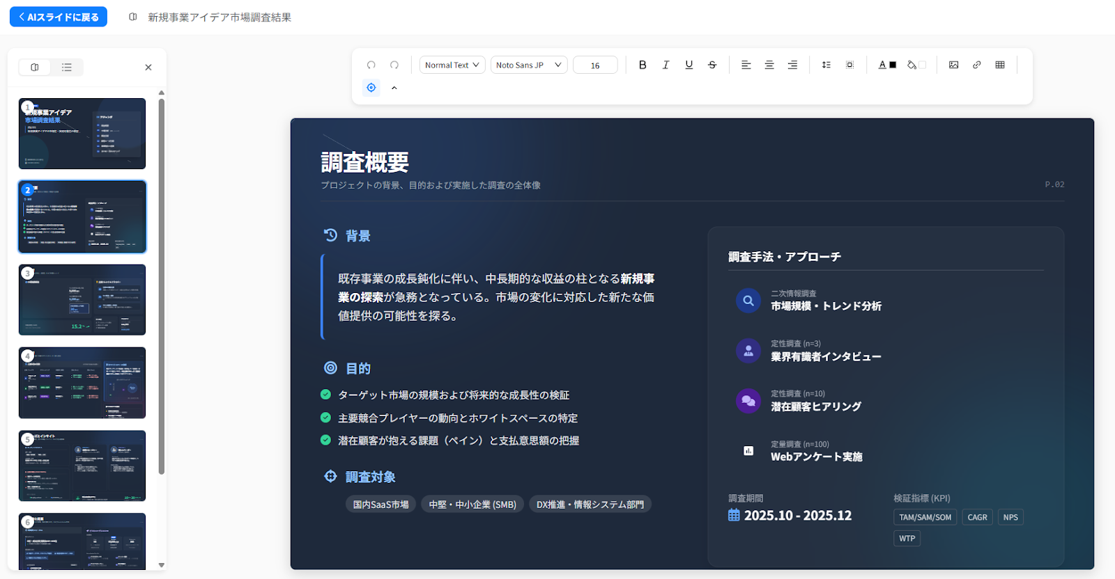 市場調査では複数ソースを横断的に整理し、スライド作成では構成・デザインまで含めて、そのまま共有できる完成度を実現しました。