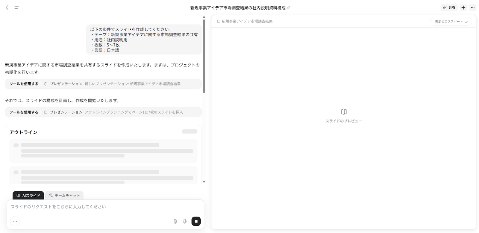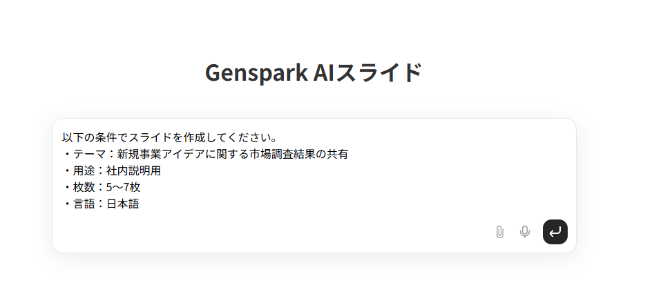 単に「スライドを作って」と指示するのではなく、「5〜7枚」といった枚数指定、さらに「社内説明用」といったターゲットを明確に指定してください。