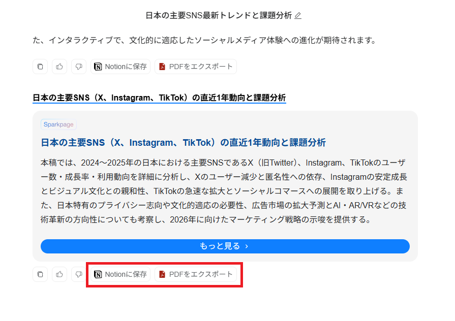 作成したレポートは「Notion保存」や「PDFエクスポート」がワンクリックで行えるため、ツールを跨ぐ手間なく素早くチームへ共有できる実用性を備えています。