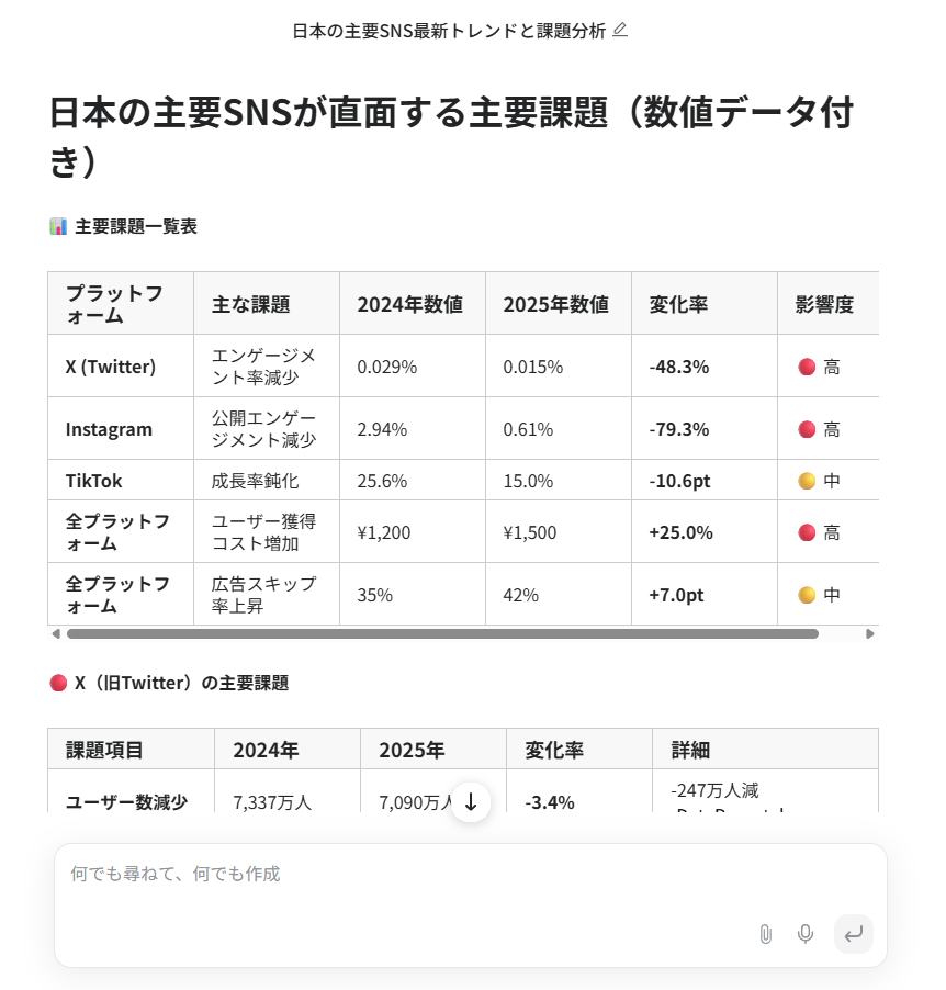 今回は「主要な課題について、具体的な数値データを含めて表形式でまとめて」と入力してみました。
