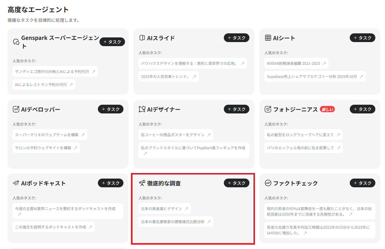 Gensparkは単なる検索ツールではなく、複数のAIエージェントが連携して「情報の収集・検証・ページ生成」を自動で行う、まさに専属のリサーチチームのような存在です。