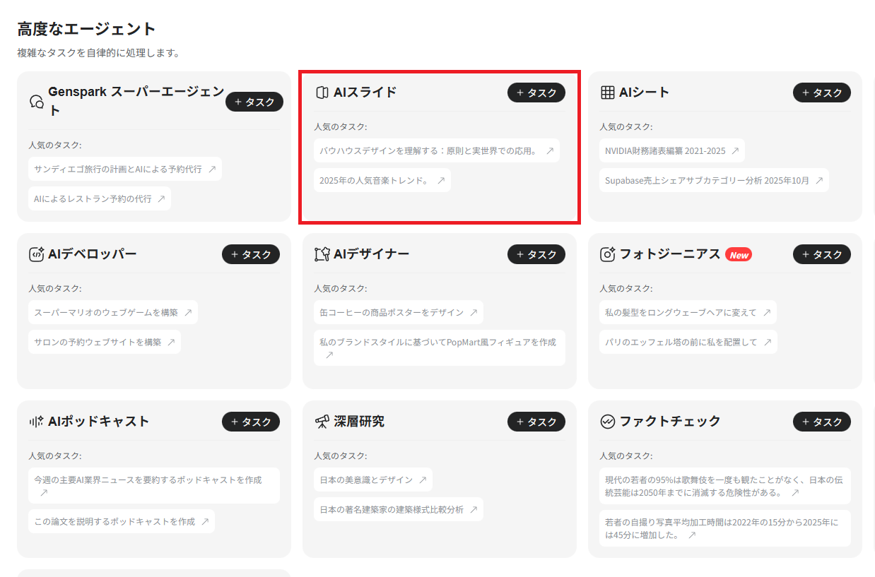 今回は、 テーマを入力するだけで高品質なプレゼン資料を自動生成できるGensparkの「AI Slides」機能 を検証しました。
