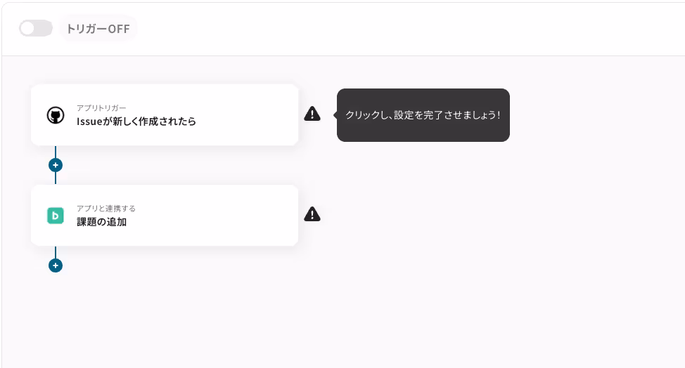 ※以下の画面は、Yoomページ画面左側「マイプロジェクト」のフローボットで表示される、「【コピー】 GitHubでIssueが作成されたらBacklogに課題を追加する」をクリックすると表示されます。