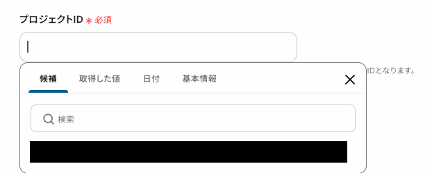 「プロジェクトID」は、入力欄をクリックして表示される候補から選択するか、入力欄下の説明に従って、入力してください。