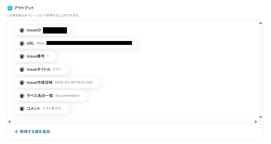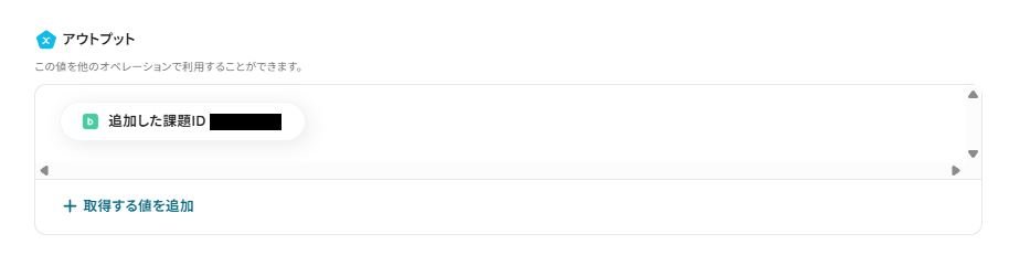 ※表示されているアウトプットは「この値を他のオペレーションで利用することができます。」と表記があるように、次の設定でも活用できます。