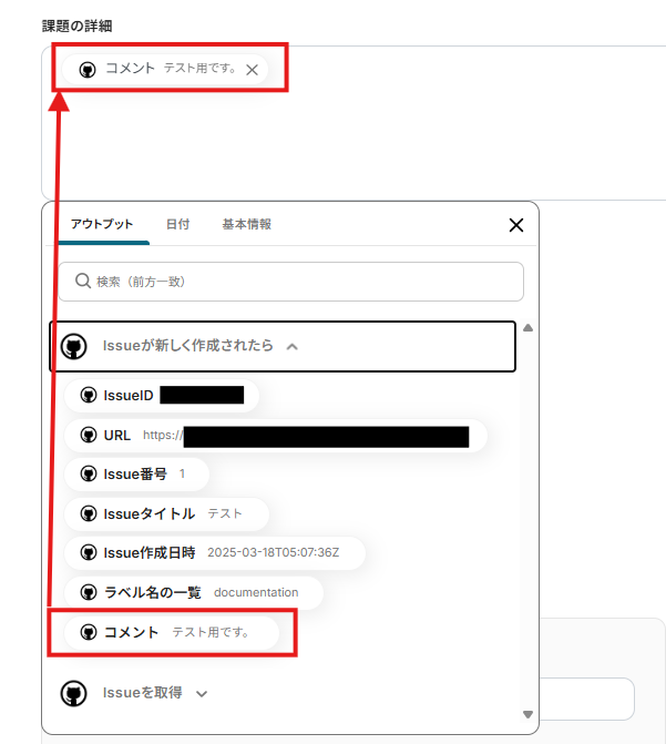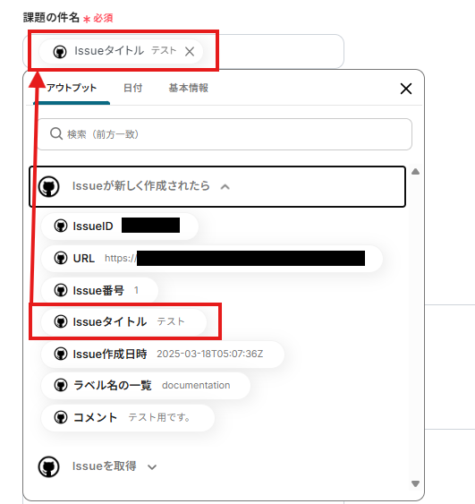 「課題の件名」は、入力欄をクリックして表示されるアウトプットから選択してください。このようにアウトプットを引用することで、毎回異なる値を反映できます。