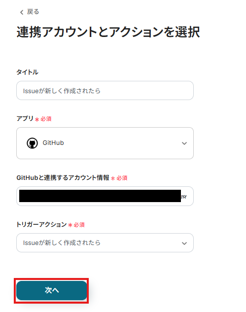 2.表示された画面で各項目を確認します。トリガーアクションはそのままにして、「次へ」をクリックしましょう。
