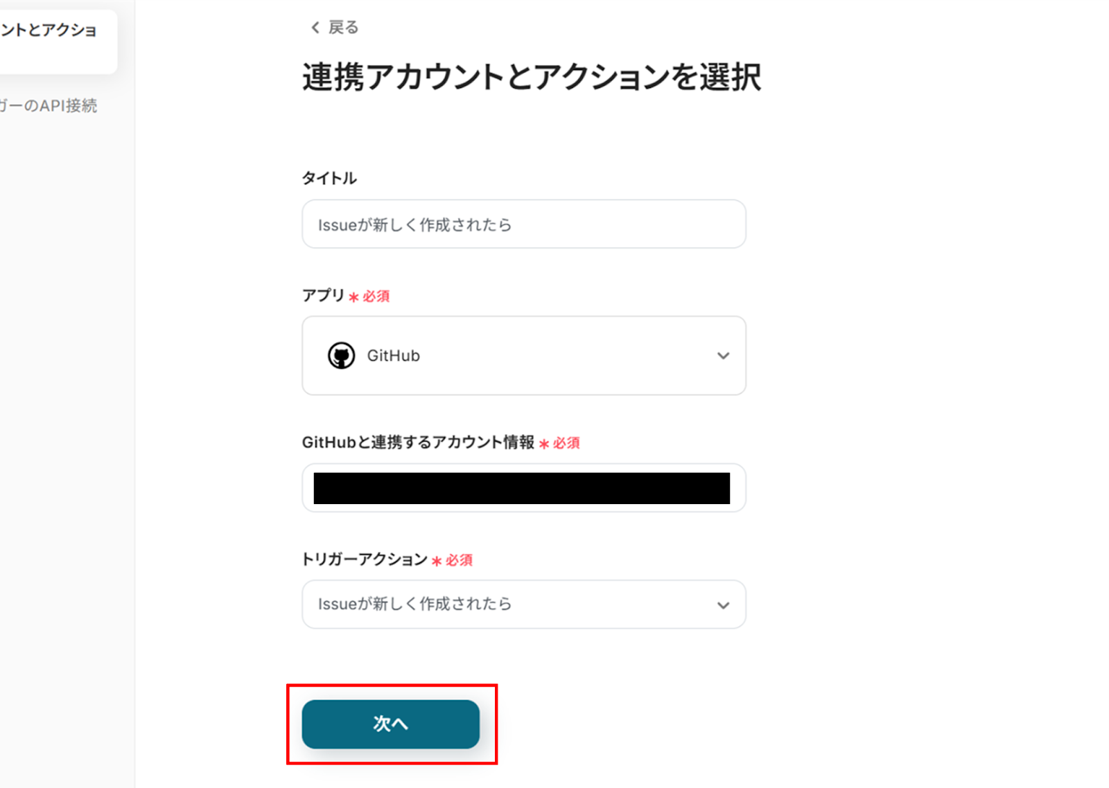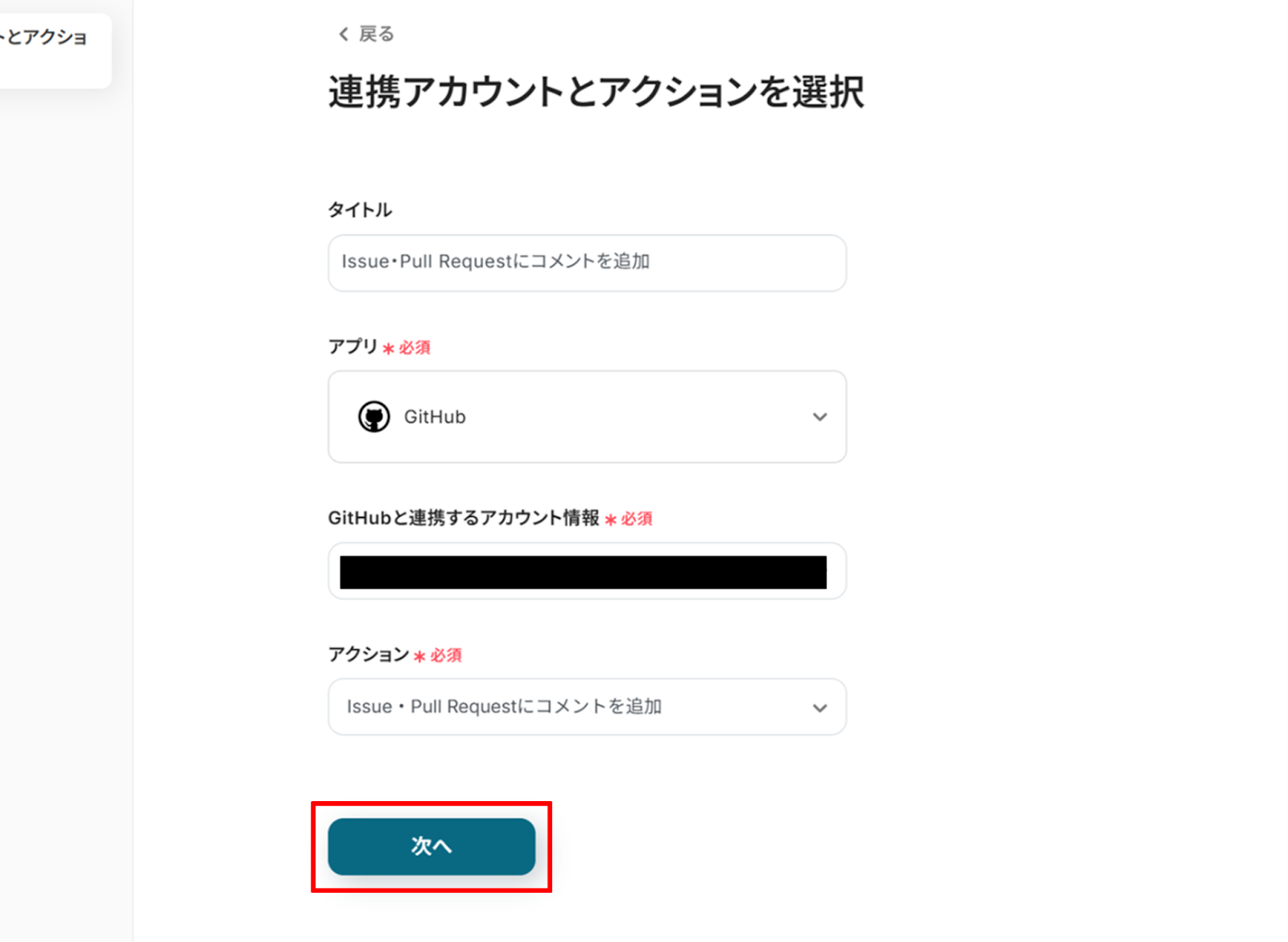 アクションは「Issue・Pull Requestにコメントを追加」のままで「次へ」をクリックしてください。