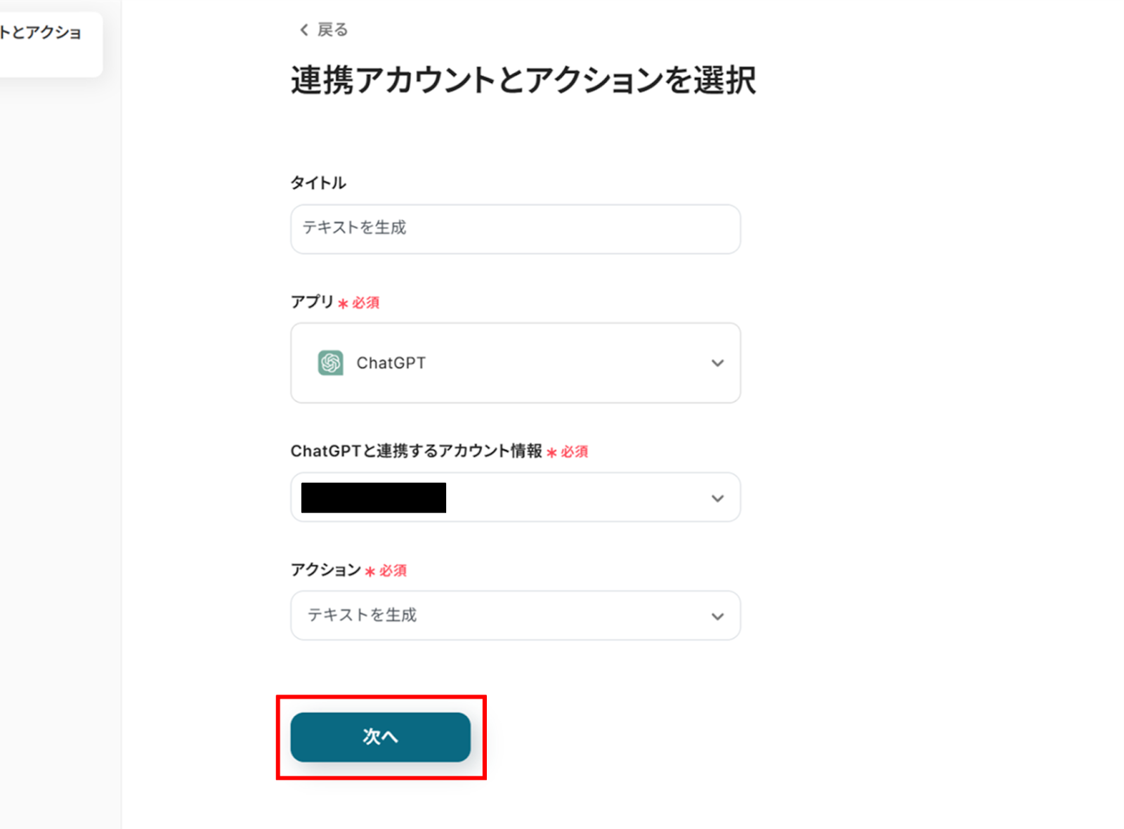 (2)ChatGPTの「連携アカウントとアクションを選択」画面から、ChatGPTと連携するアカウント情報に誤りがないかを確認し、アクションは「テキストを生成」のままで「次へ」をクリックします。