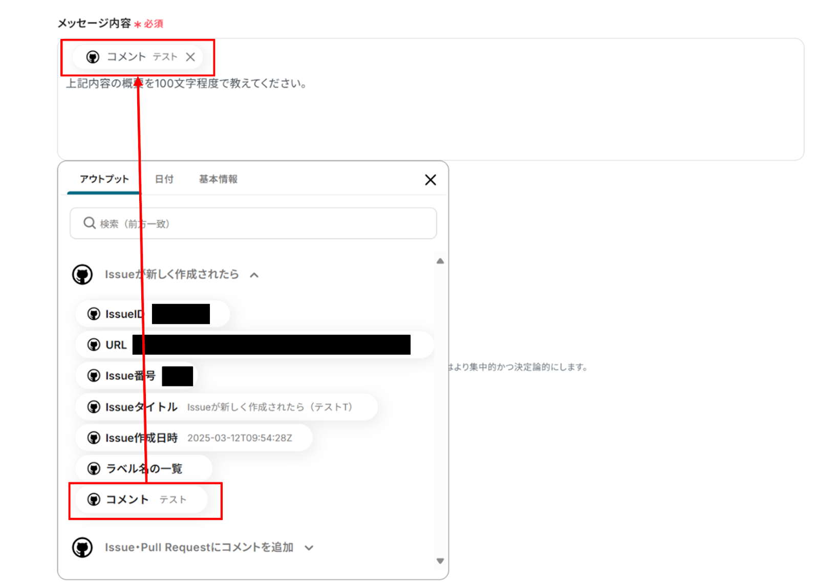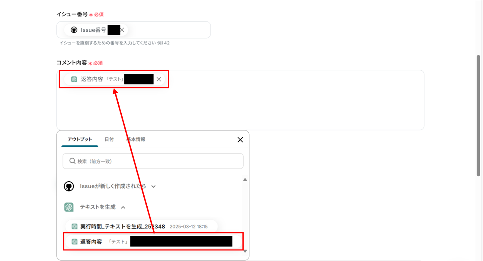 下へ進み、イシュー番号、コメント内容をアウトプットを使って入力します。