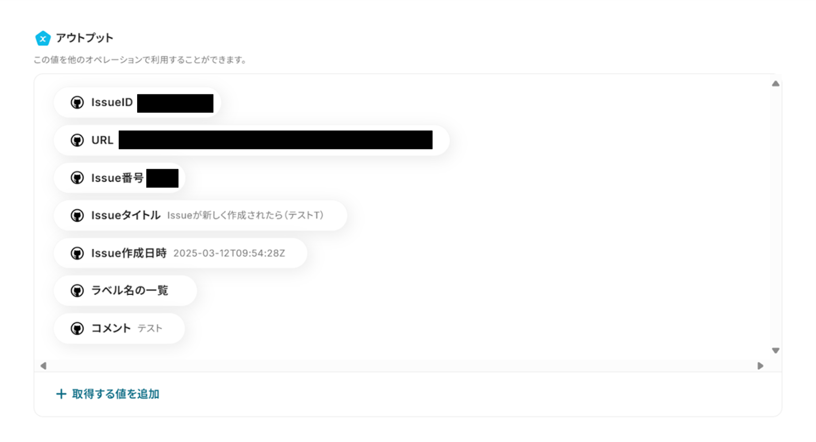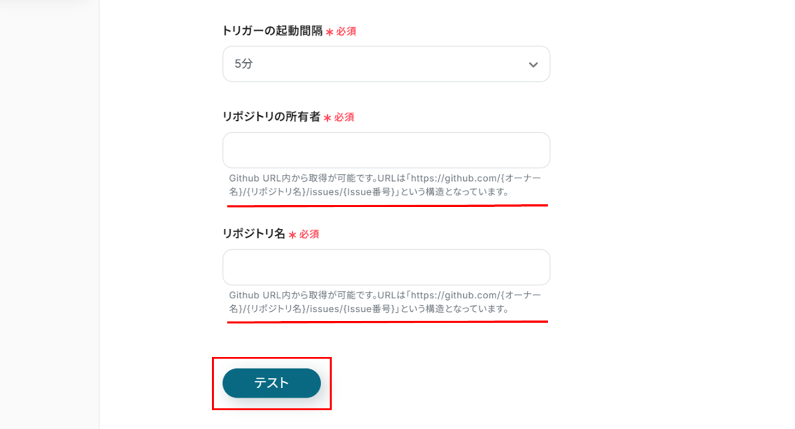 入力が完了したら、実際にGitHubでIssueを作成し、Yoomで「テスト」をクリックします。