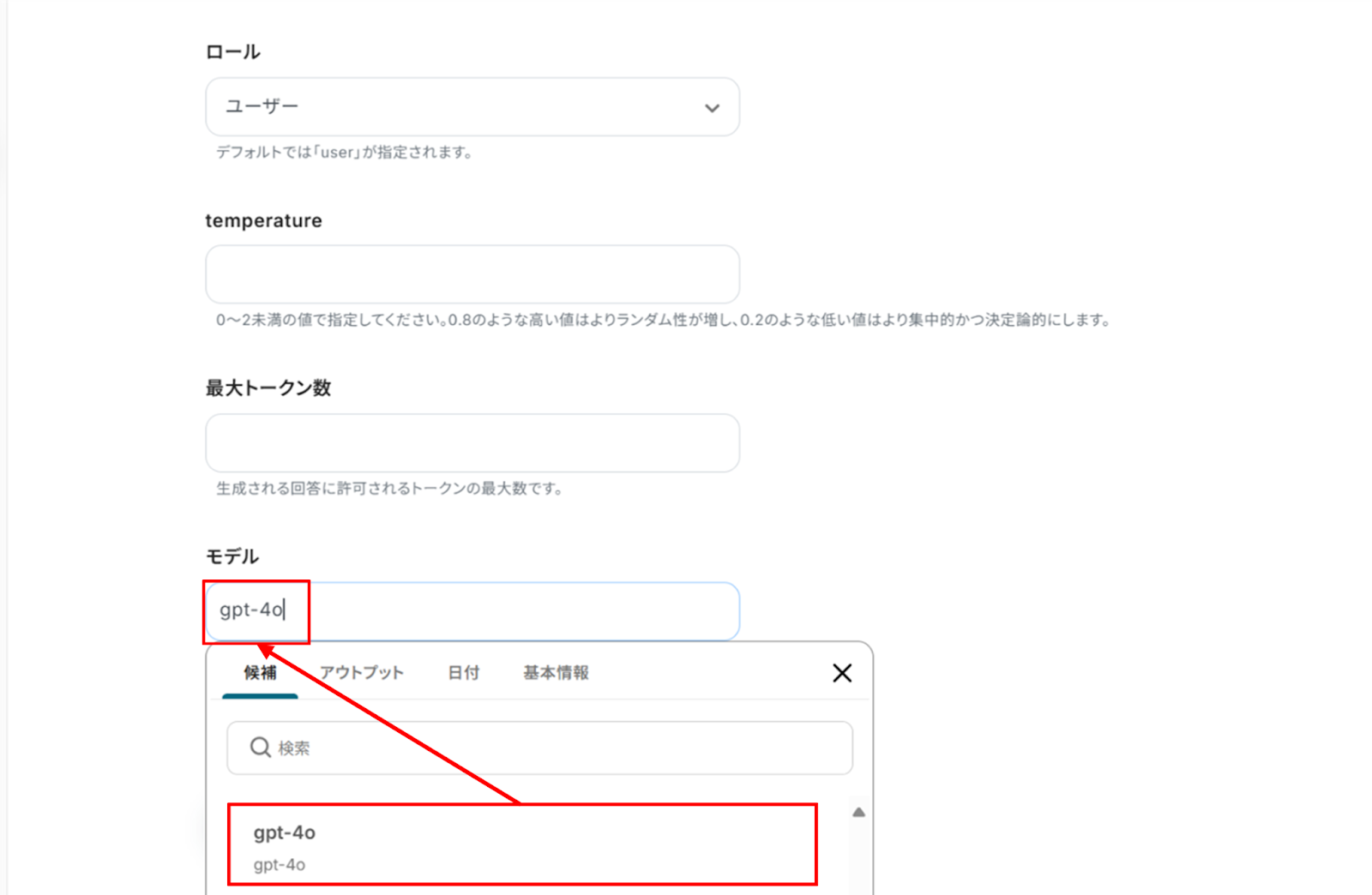 - temperature・最大トークン:赤線を確認の上、直接入力