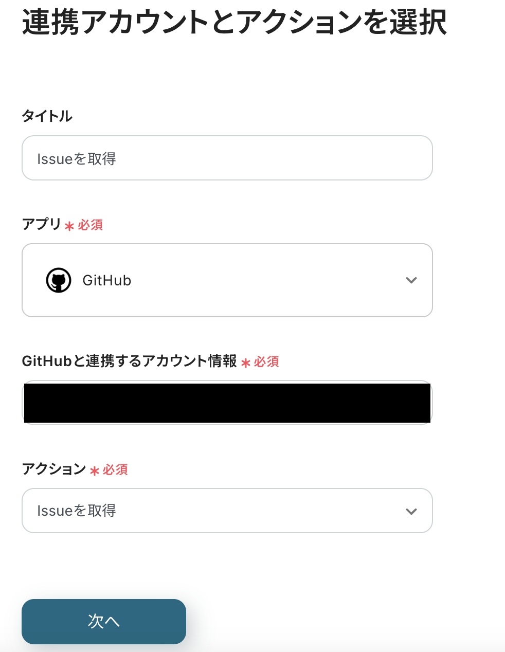 アクションは「Issueを取得」を選択しましょう。