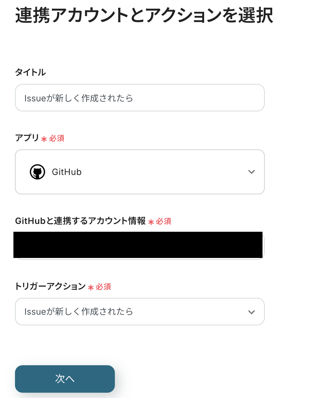トリガーは「Issueが新しく作成されたら」を選択し、次へをクリックしてください。