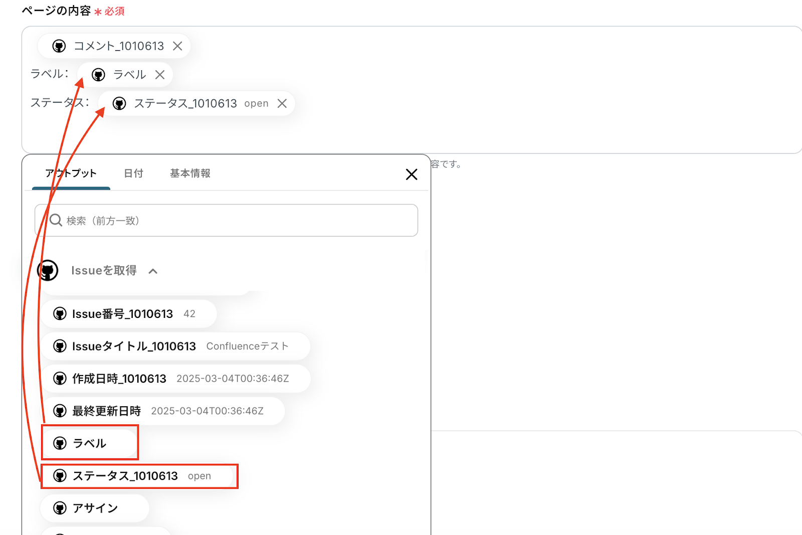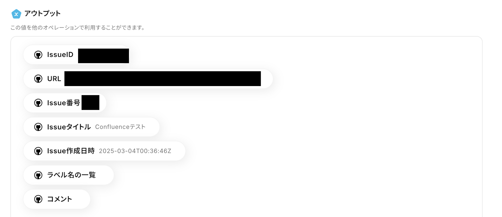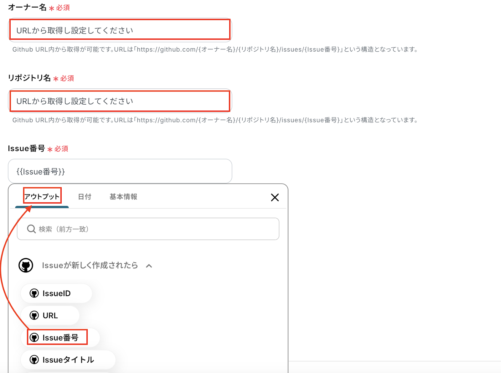 Issue番号は、GitHubのトリガーで取得した「Issue番号」をアウトプットから選択しましょう。