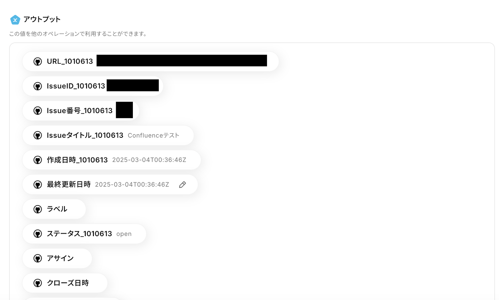 アウトプットとは、トリガーやオペレーションで取得した値のことです。