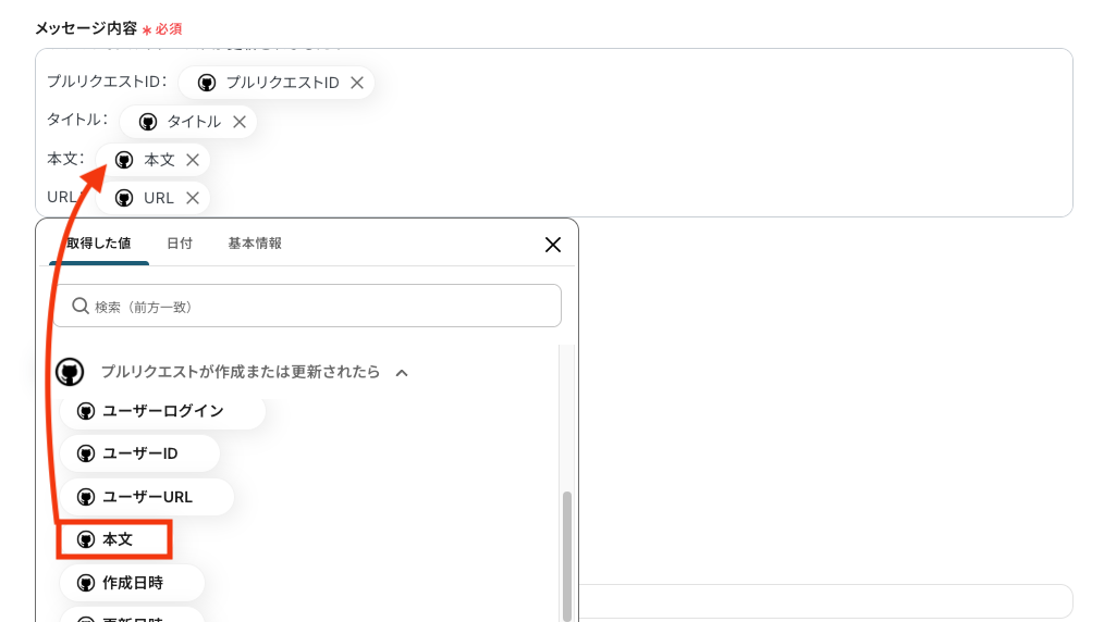 入力欄をクリックすることで、前段で取得したアウトプットを挿入でき、任意のテキストと組み合わせて自由にメッセージを作成できます。
