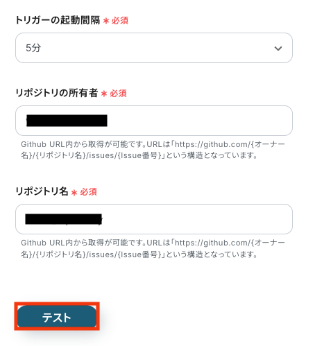 各項目の入力が完了したら、設定した内容とトリガーの動作を確認するため、「テスト」をクリックします。