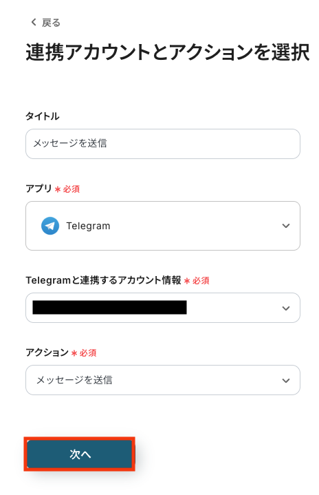 Telegramと連携するアカウント情報に問題がなければ、「次へ」をクリックします。