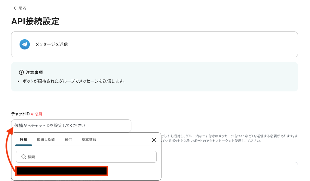 入力欄をクリックすると候補が表示されるので、対象のチャットグループを選択しましょう。