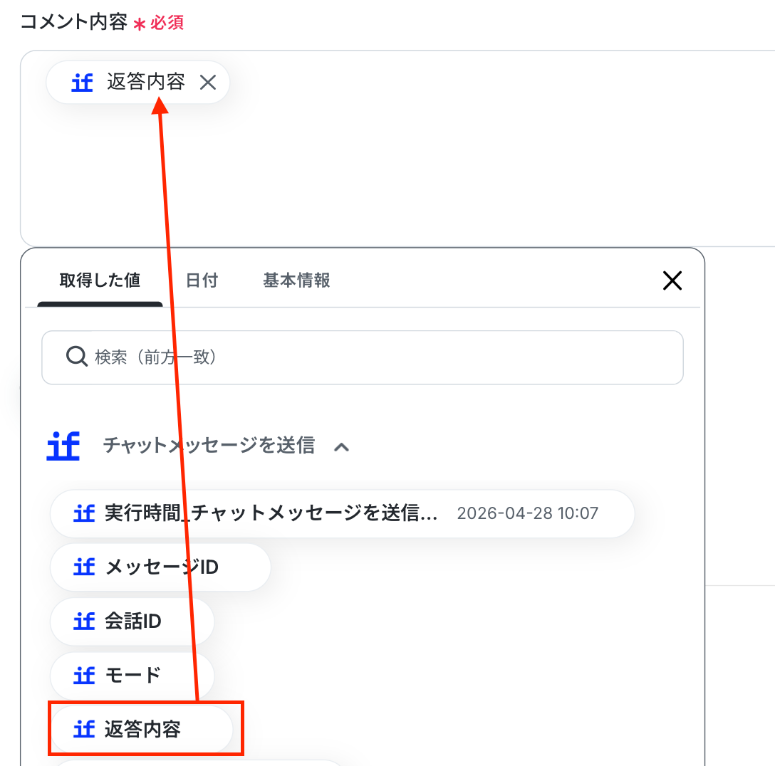 - 次に、オペレーションでDifyの「チャットメッセージを送信」アクションを設定し、取得したチケット内容を基に回答案を生成させます。
