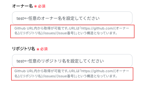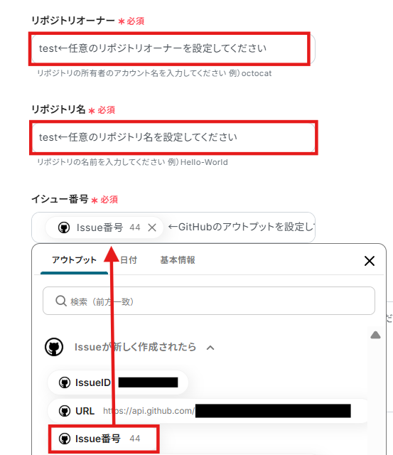 - GitHubでコメントを追加するアクションでは、コメントを投稿するリポジトリのオーナー名、リポジトリ名、イシュー番号、そしてDifyで生成した要約などのコメント内容を指定します。