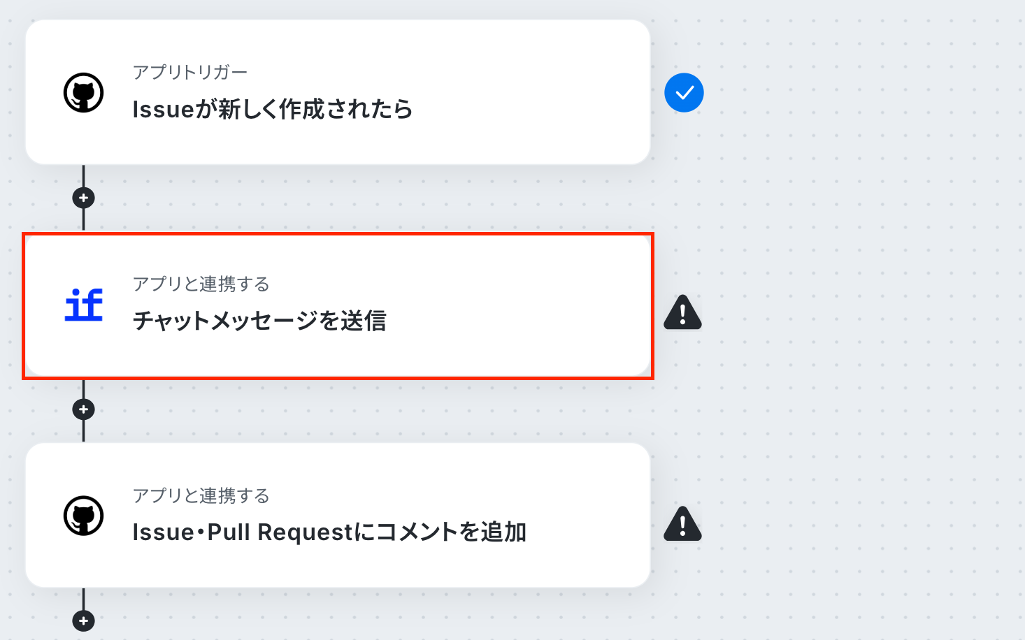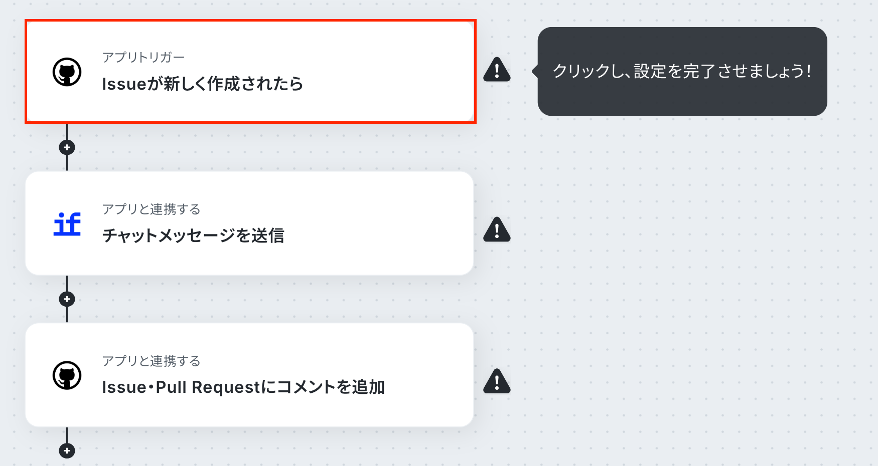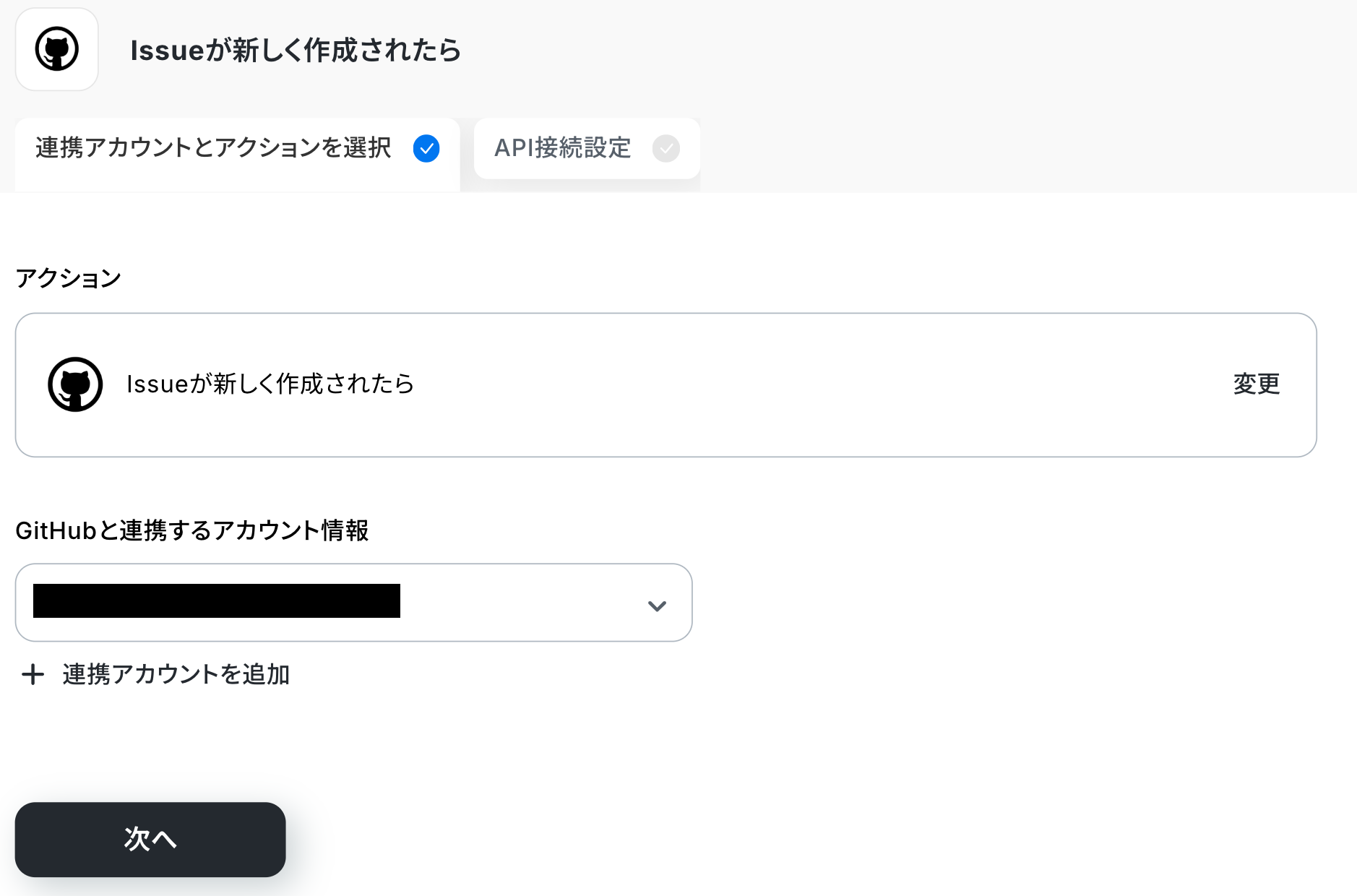 - 次に、トリガーでGitHubを選択し、「Issueが新しく作成されたら」というアクションを設定します。