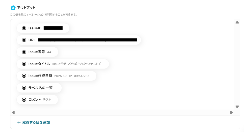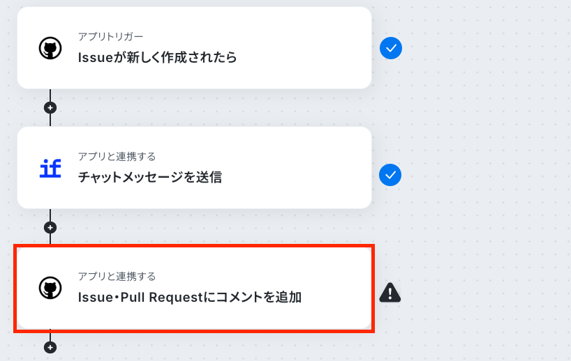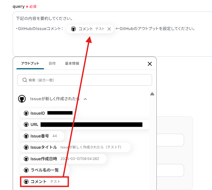 - 最後に、オペレーションでGitHubの「Issue・Pull Requestにコメントを追加」アクションを設定し、Difyで生成された要約を該当のIssueにコメントとして投稿します。