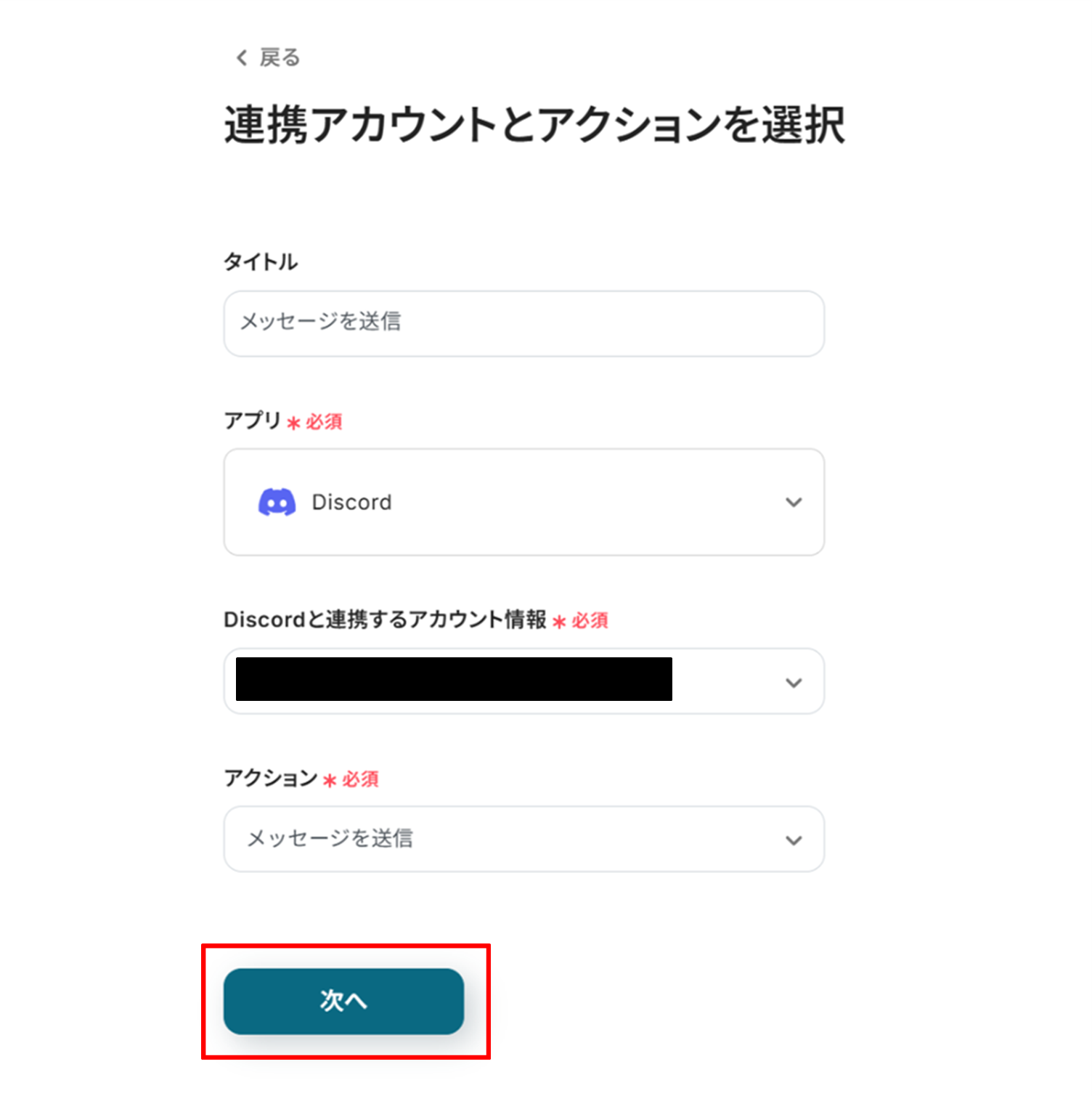 (2)Discordの「連携アカウントとアクションを選択」画面が表示されます。今回使用するアカウント情報で誤りがないかを確認し、アクションは「メッセージを送信」のままにして「次へ」をクリックします。
