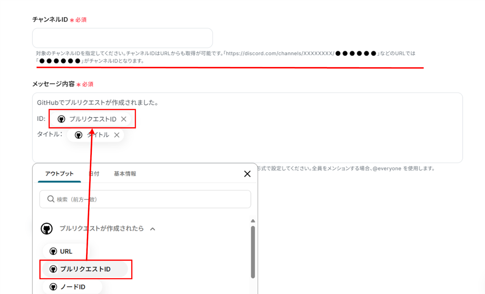 「GitHubでプルリクエストが作成されました。」など、毎回同じテキストを使用する部分は定型文として固定値で入力しましょう。